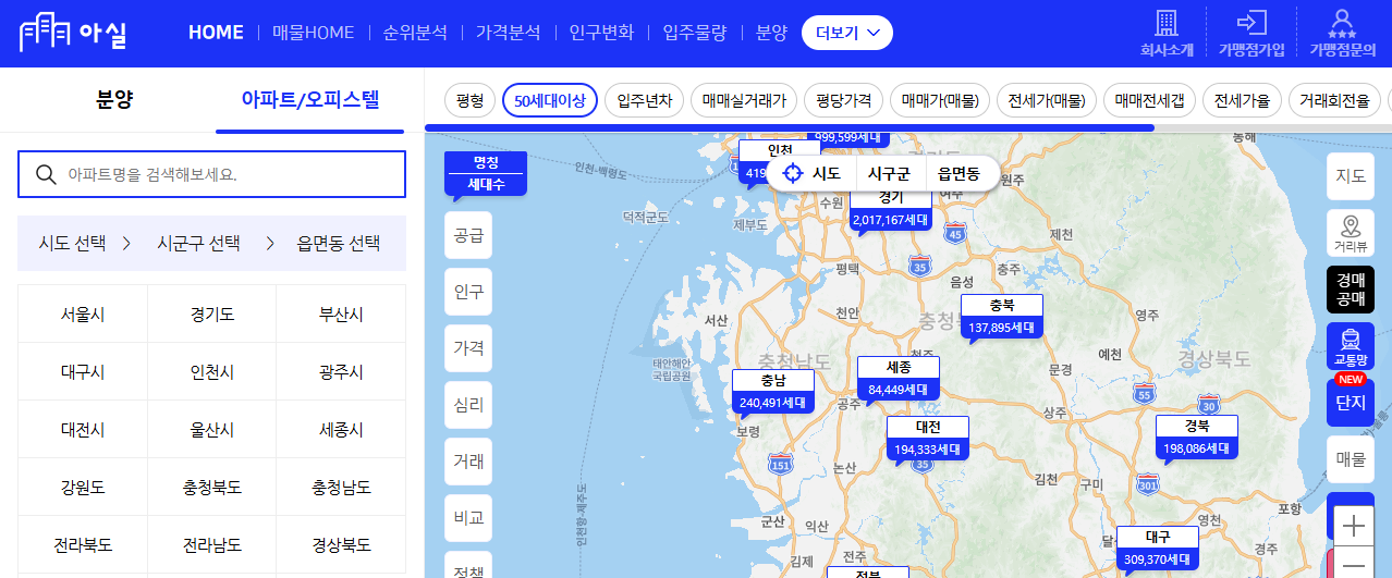 전국 아파트와 오피스텔, 분양·입주 예정지, 기존 단지의 실거래가·시세·매물 정보·통계 분석을